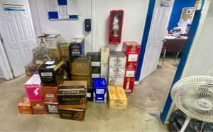 Entre los artículos recuperados figuran cajas de bebidas alcohólicas, cervezas, vinos, refrescos, jugos y otros productos, así como equipos y mobiliario comercial, incluyendo aires acondicionados, televisores, exhibidores, sillas metálicas y abanicos de pared, entre otros.